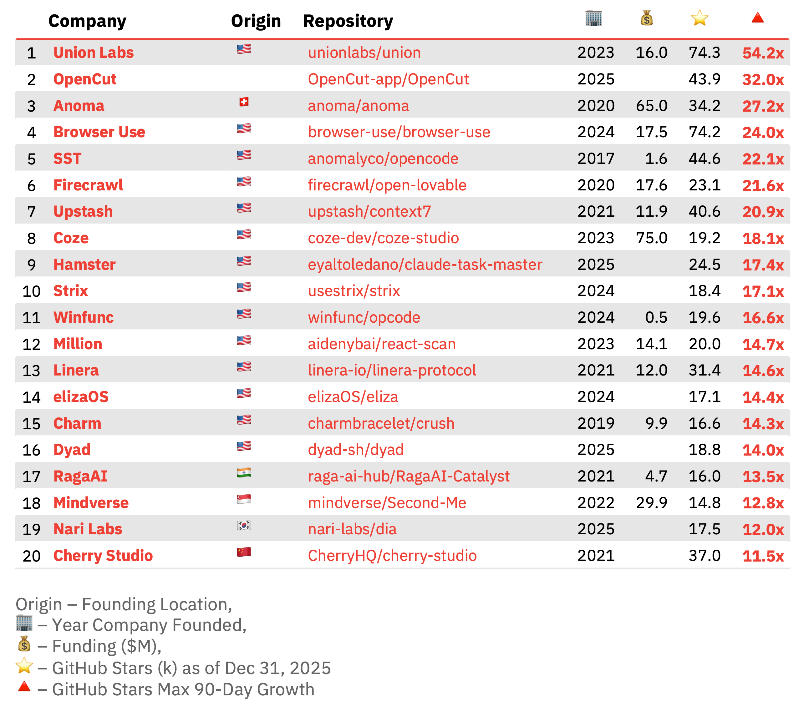 Rounding out the top five is San Francisco-based SST / Anomaly, which reached 44.6K GitHub stars for its terminal-based coding agent OpenCode during the measurement period (ending December 31, 2025), representing a peak growth rate of 22.1x. Since then, the repository’s star count has climbed rapidly, rising to 98.1K stars — an indication of how quickly momentum can build once an open source project breaks out.