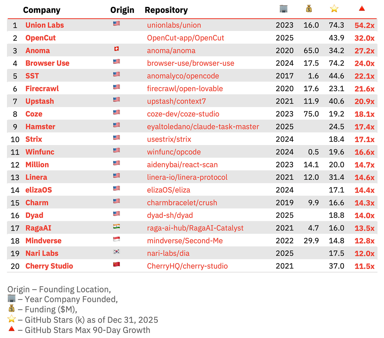 Repositories are required to pass a baseline of at least 1,000 GitHub stars before being considered. Growth is then measured across the highest-performing 90-day observation window, rather than shorter periods that tend to capture brief spikes in attention. Each entry records the quarter of peak performance, the growth multiplier, and the star count as of December 31, 2025.